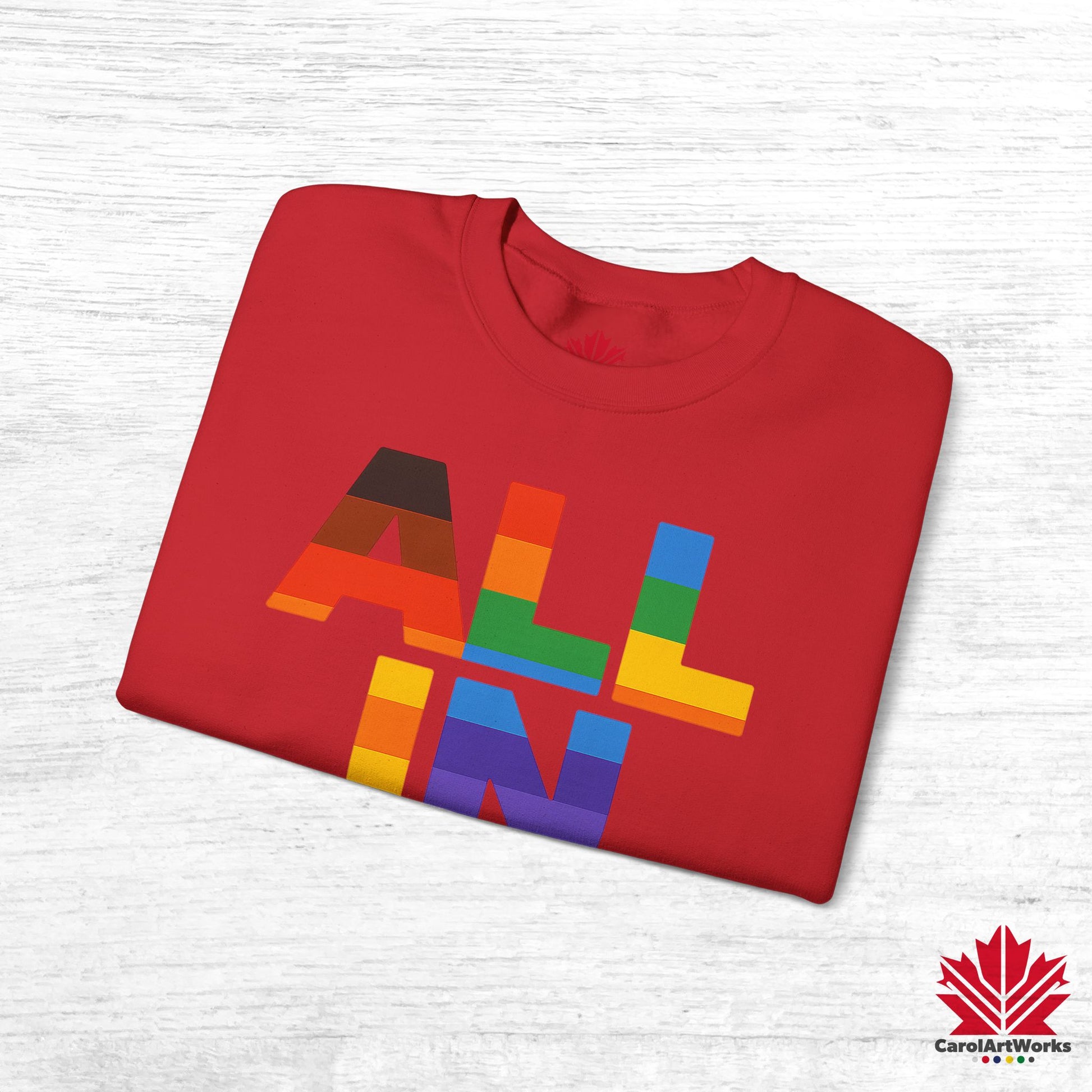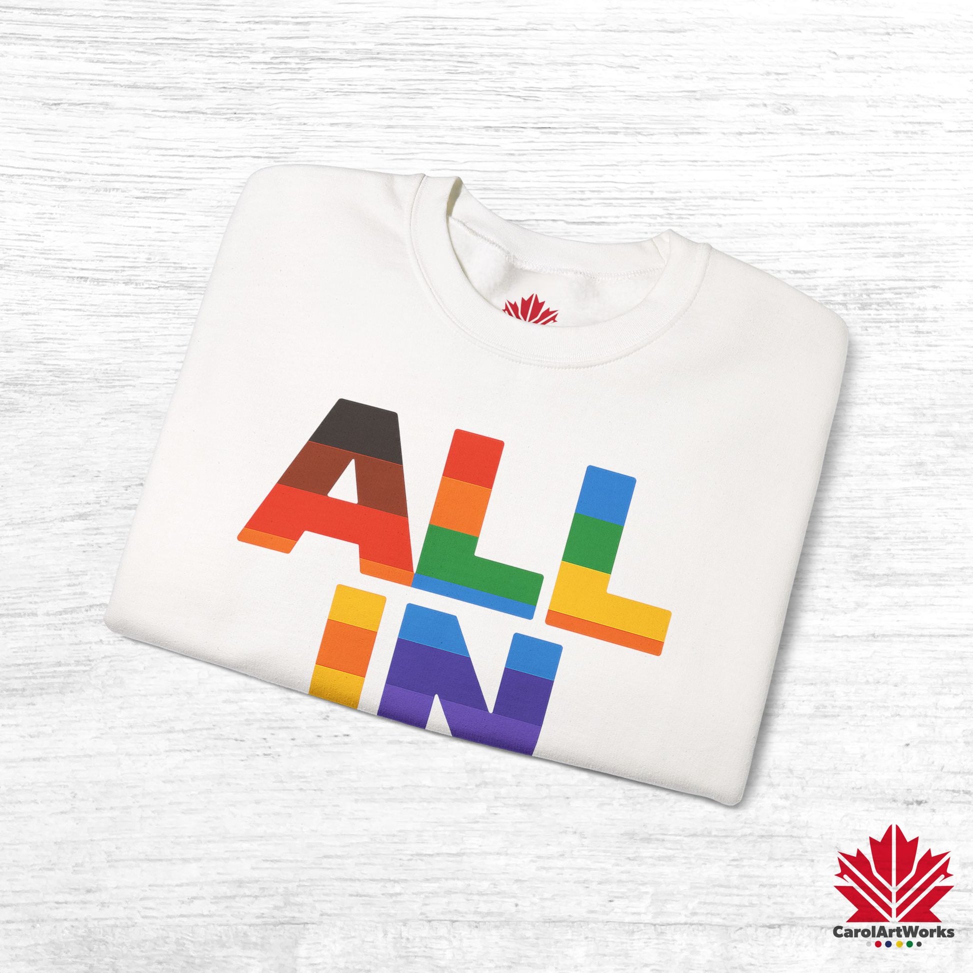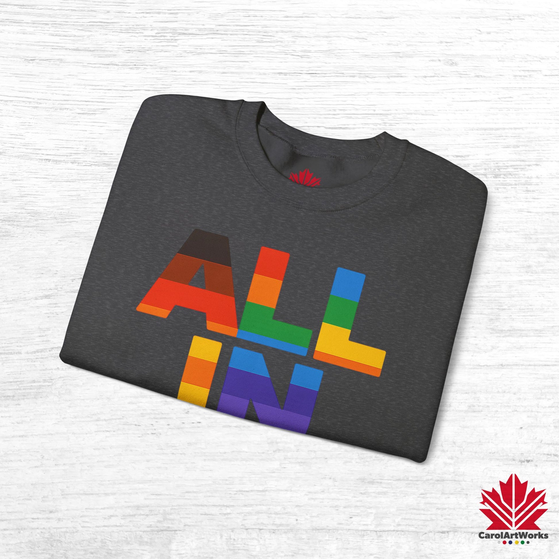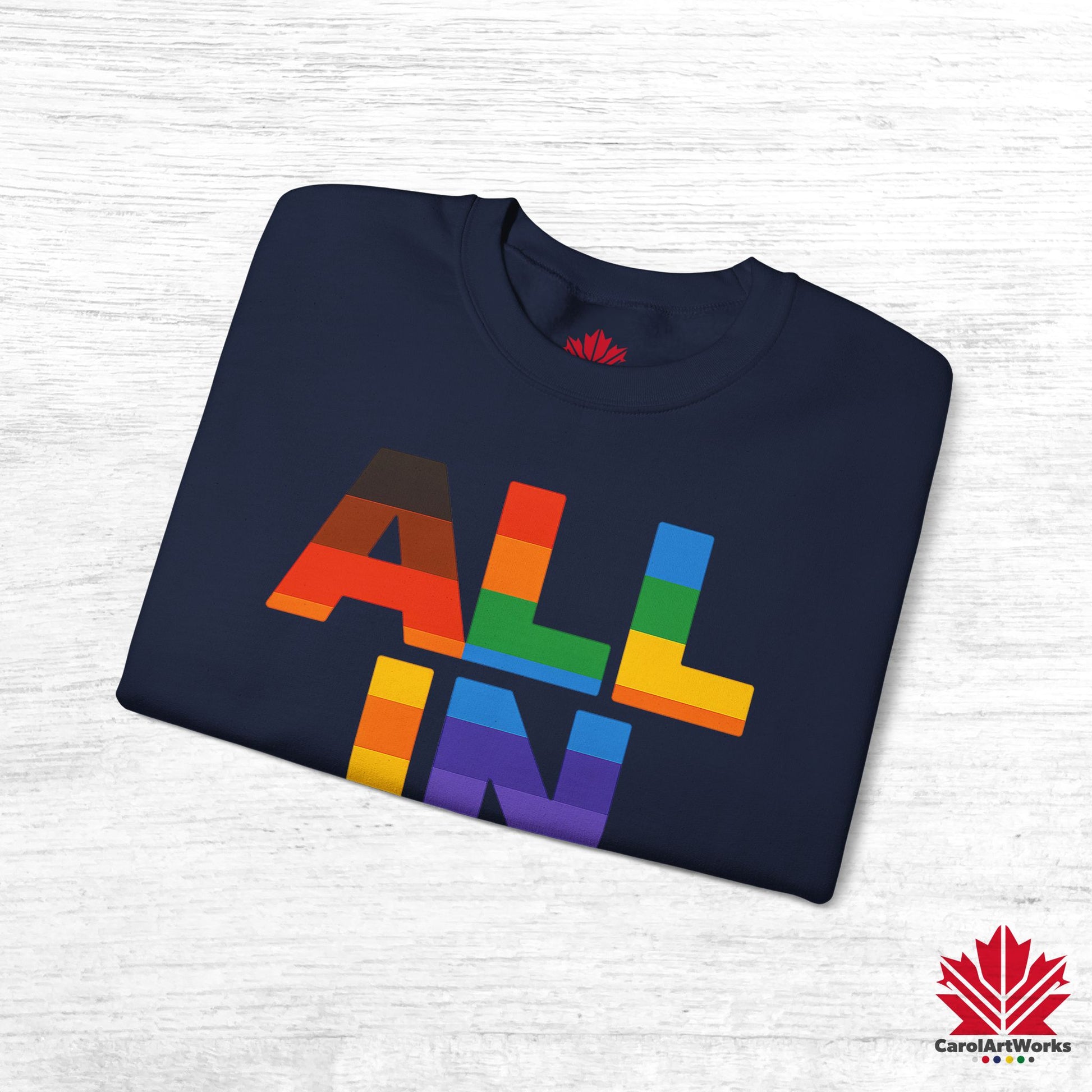 Whether you wear it to a Pride parade or a quiet coffee on the porch, “ALL IN – Heart. Voice. Pride.” speaks without shouting. It’s a quiet anthem. A bright reminder. A little revolution, worn close to the chest.
