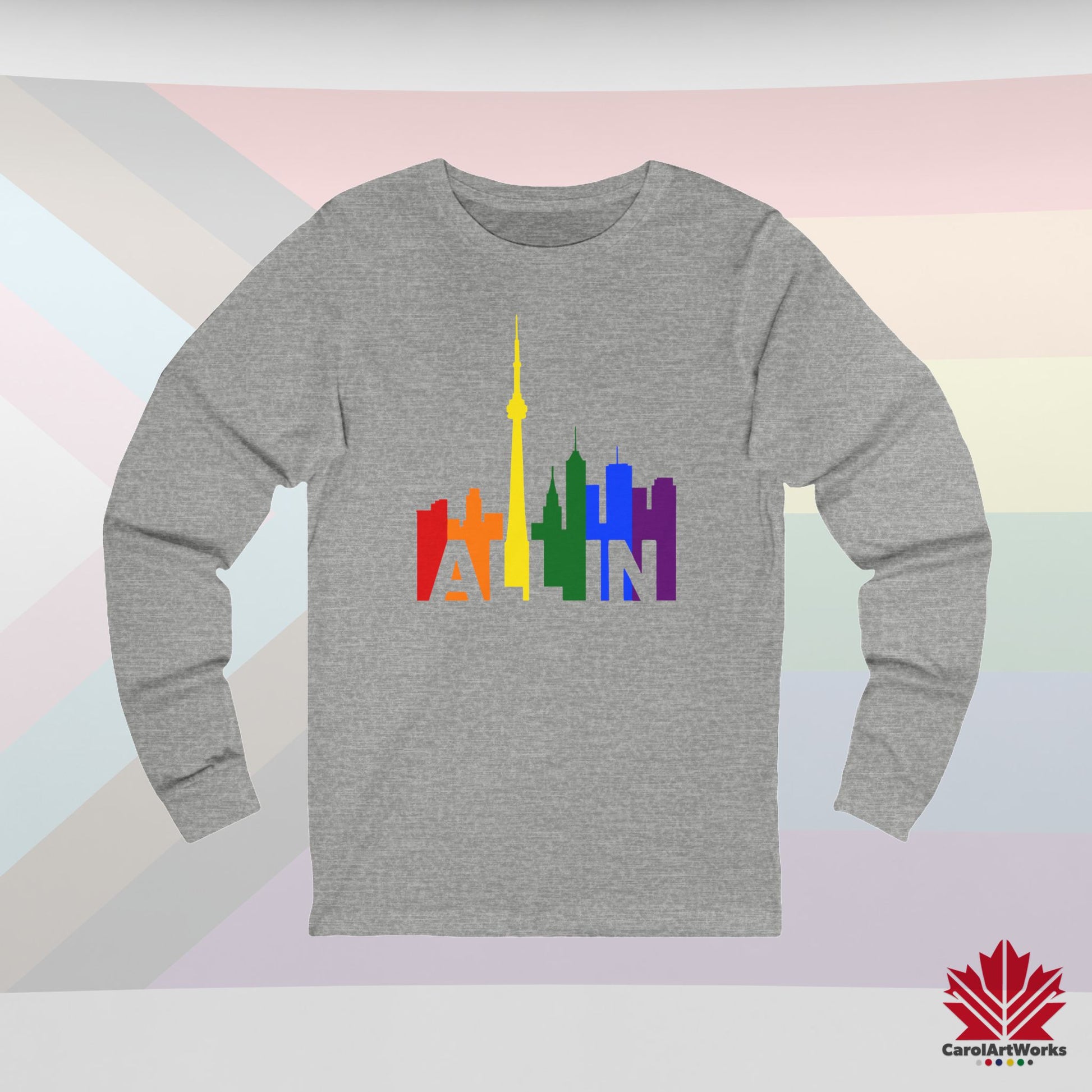 This Toronto Pride design brings the CN Tower and skyline together in a bold rainbow layout, forming the message “ALL IN” – a declaration of pride, visibility, and belonging. Whether you're at a festival, a fall market, or just standing tall in your own truth, this long sleeve shirt keeps you warm and visible – in every sense of the word.