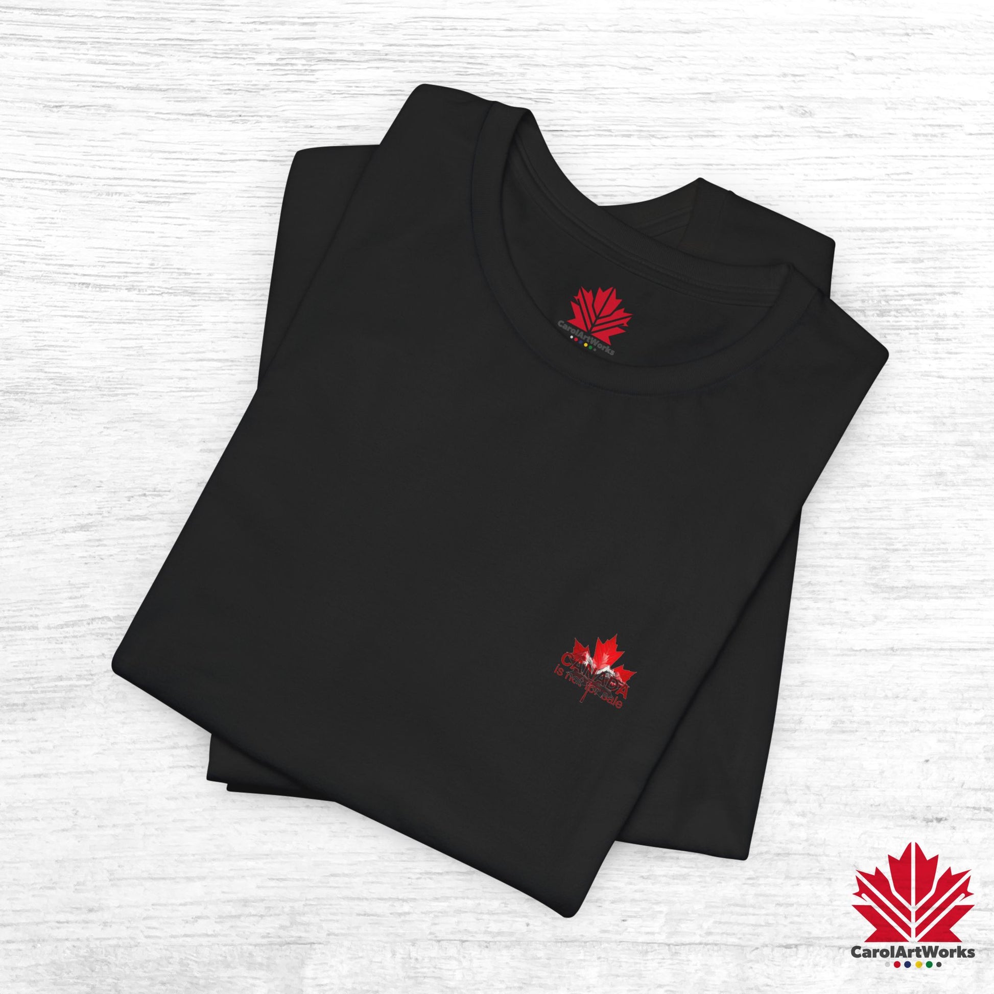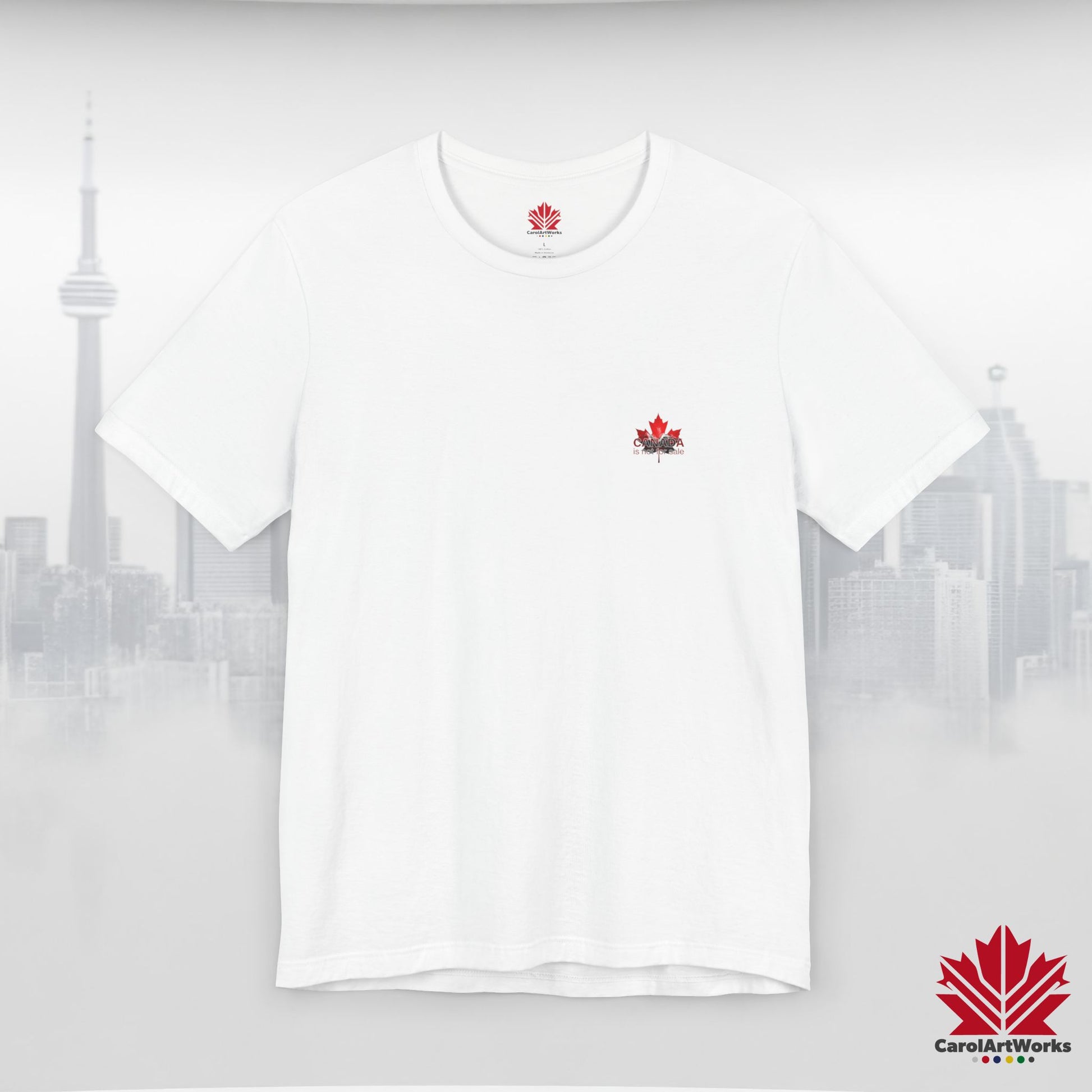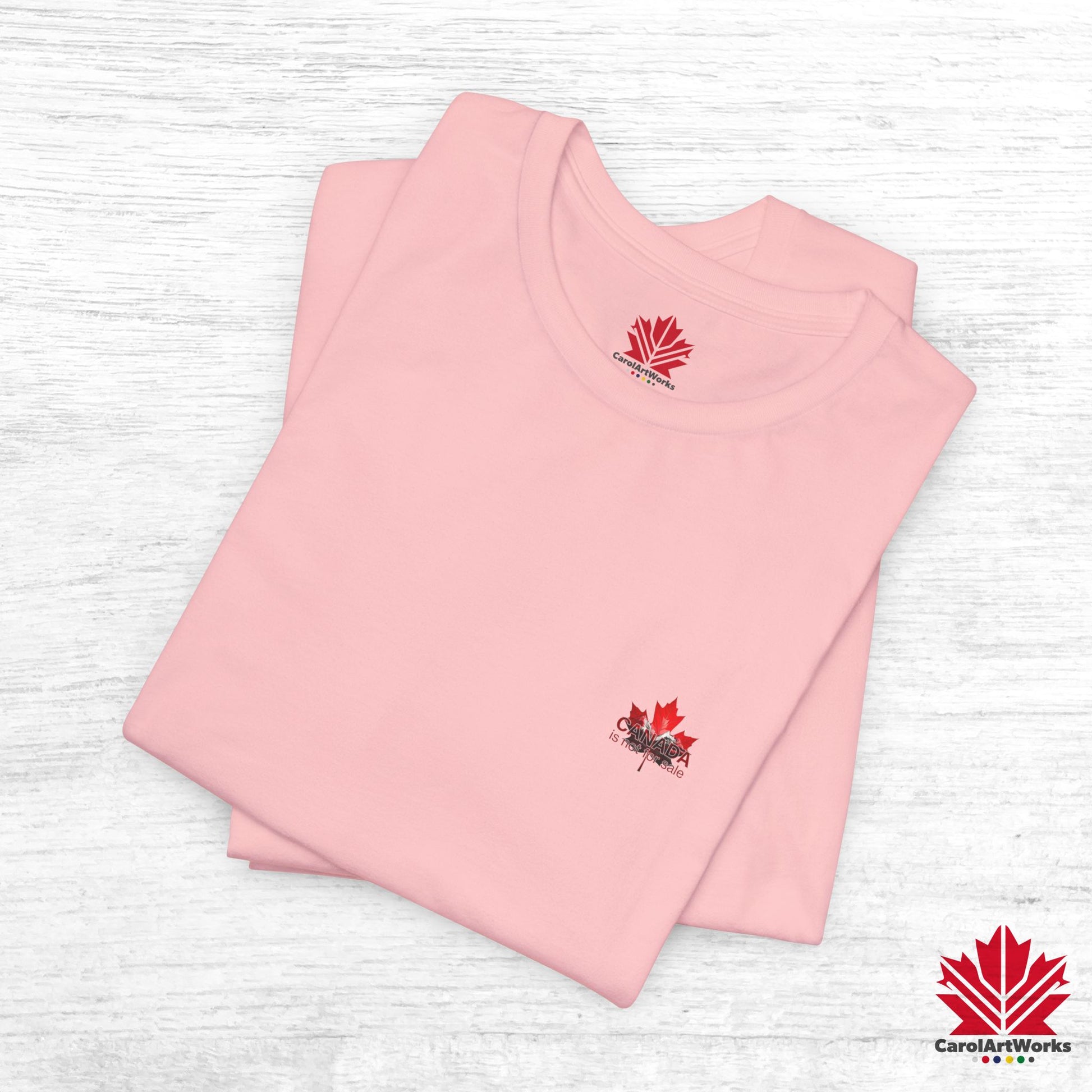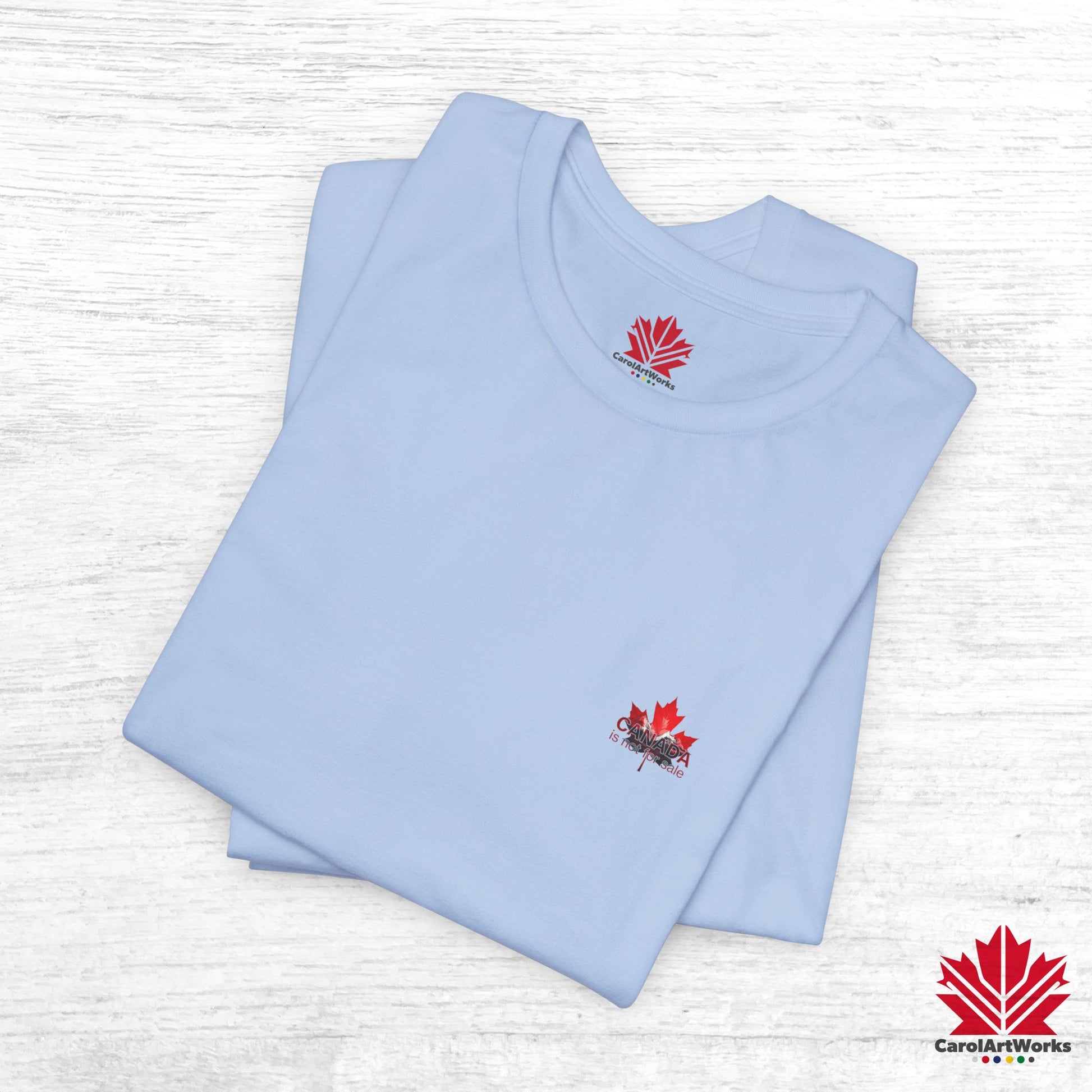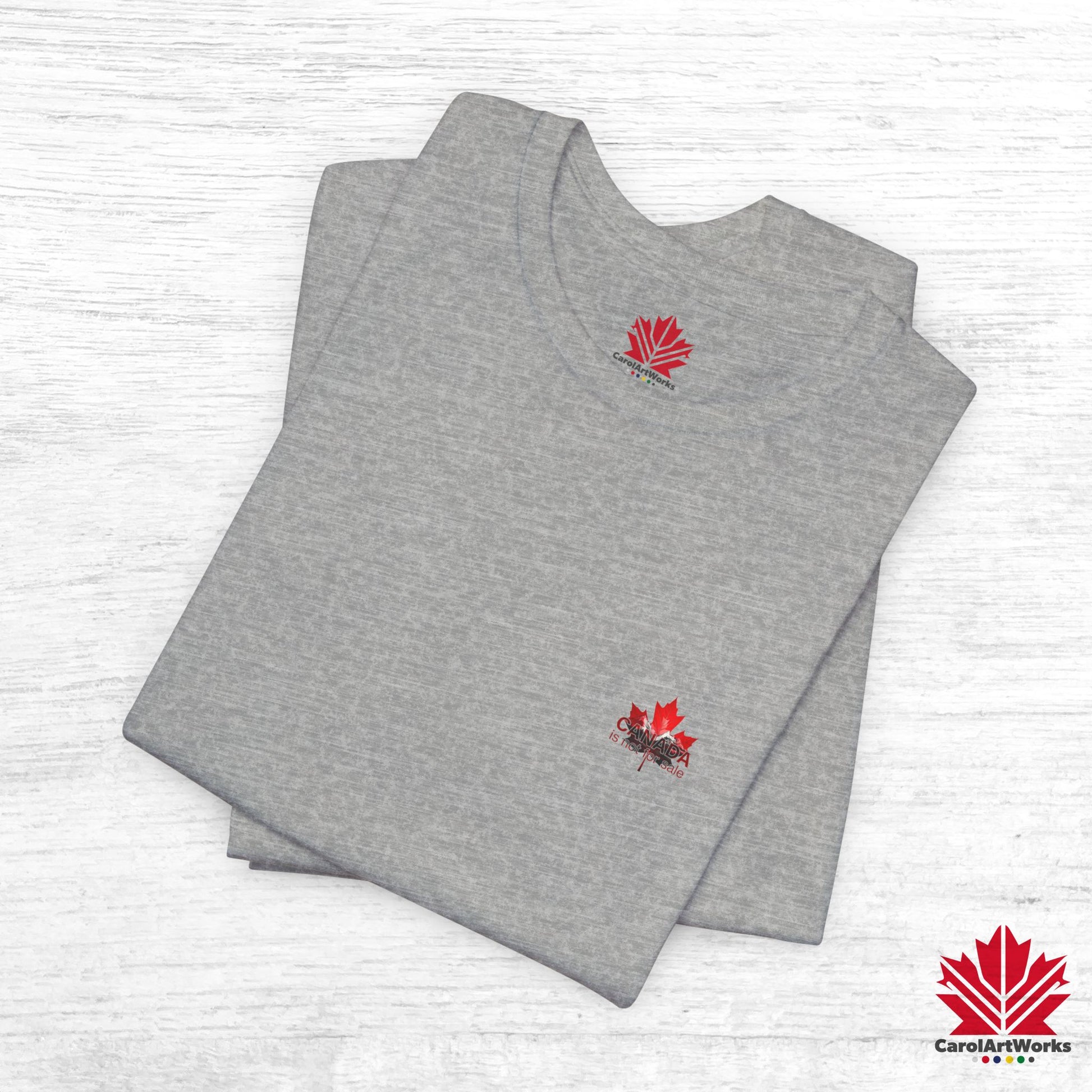 “Canada is not for Sale” Unisex Short Sleeve Tee – Red Maple Leaf and Mountains, Stylish Canada Shirt