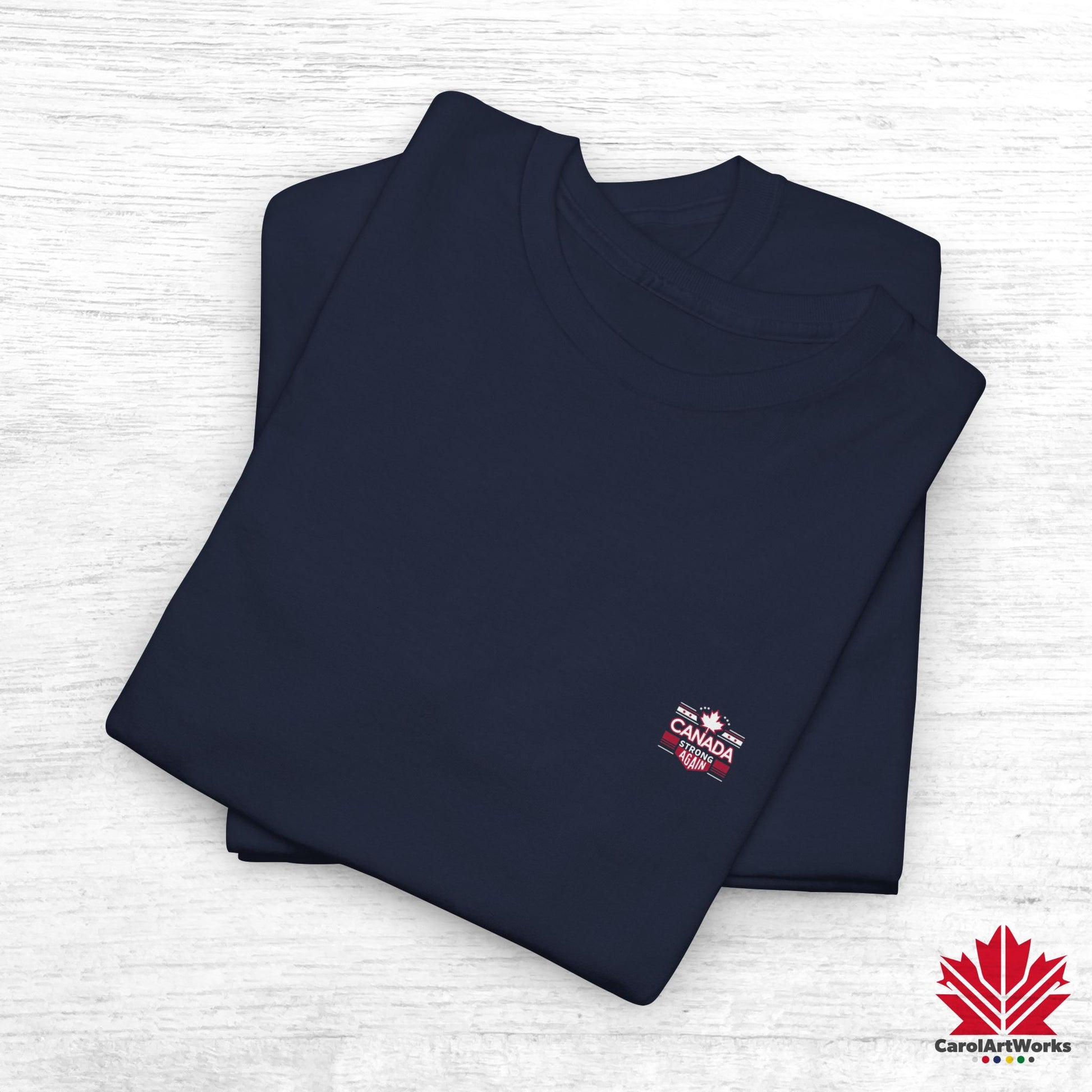 Show your Canadian pride with this striking design inspired by bold political slogans. "Canada Strong Again" is displayed in large, bold typography, making a clear and powerful statement. Above the text, a stylized maple leaf with a star-lined border adds a patriotic touch, symbolizing strength and unity.