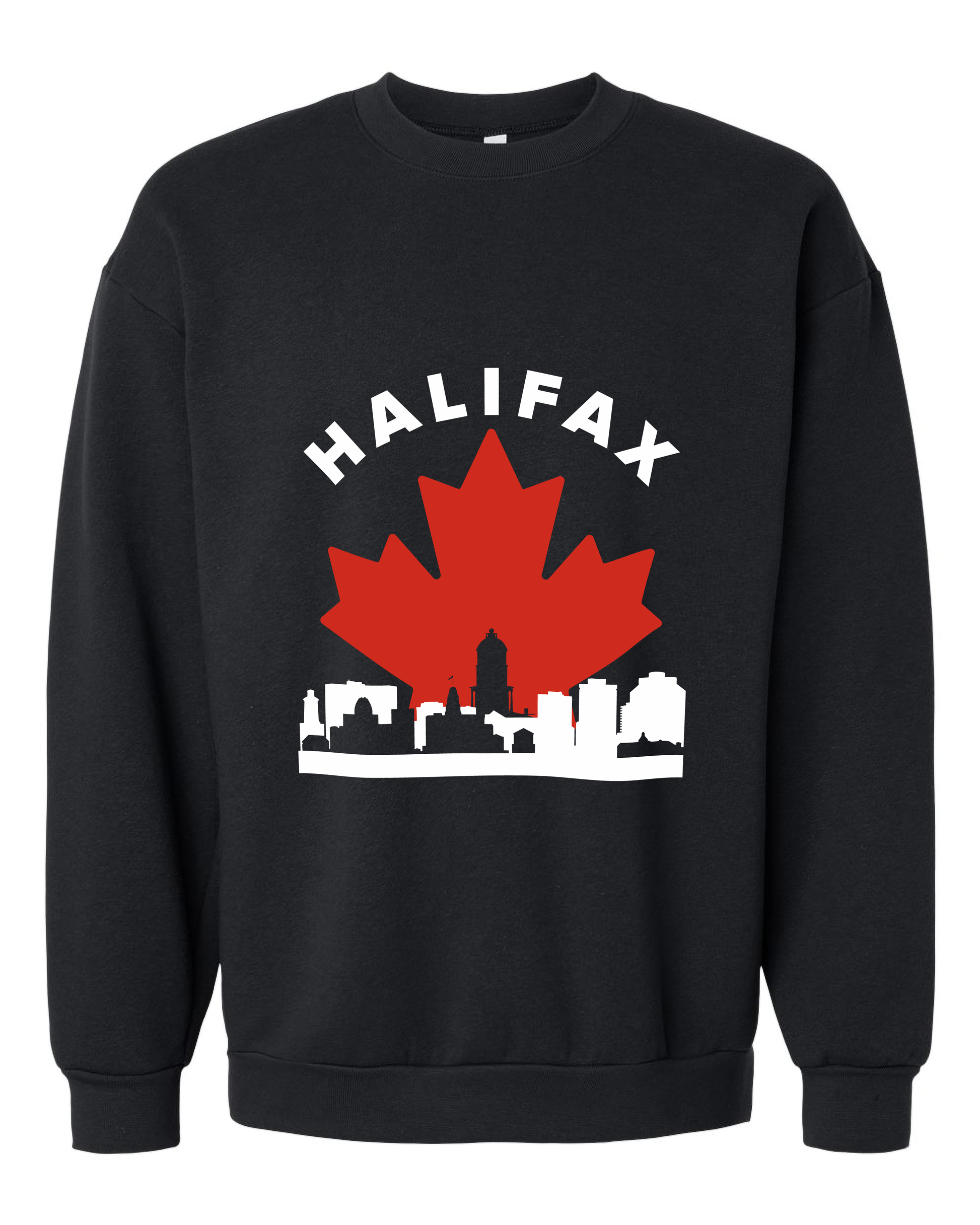 This design presents the Halifax skyline framed by a bold maple leaf.