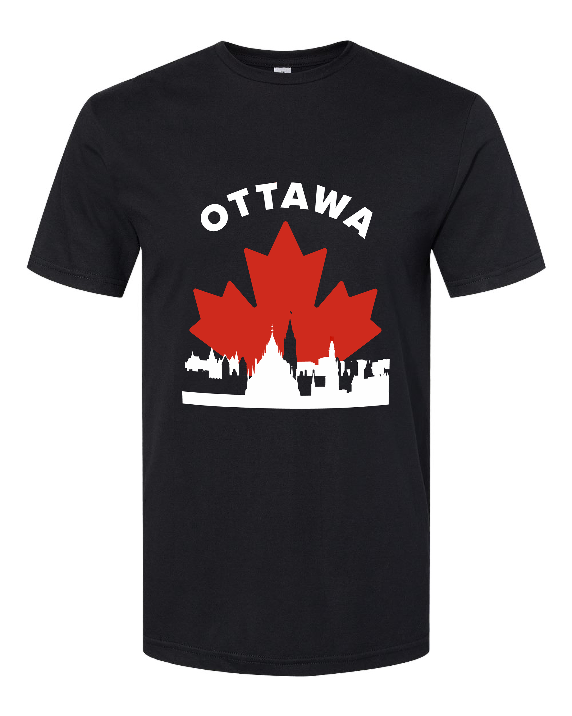 This design depicts the Ottawa skyline set against a bold maple leaf.