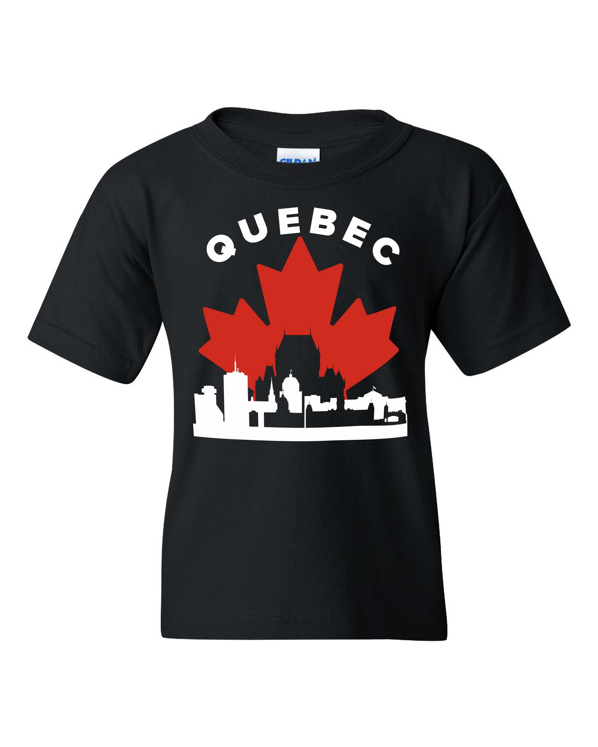 This design depicts the Québec City skyline set against a bold maple leaf.