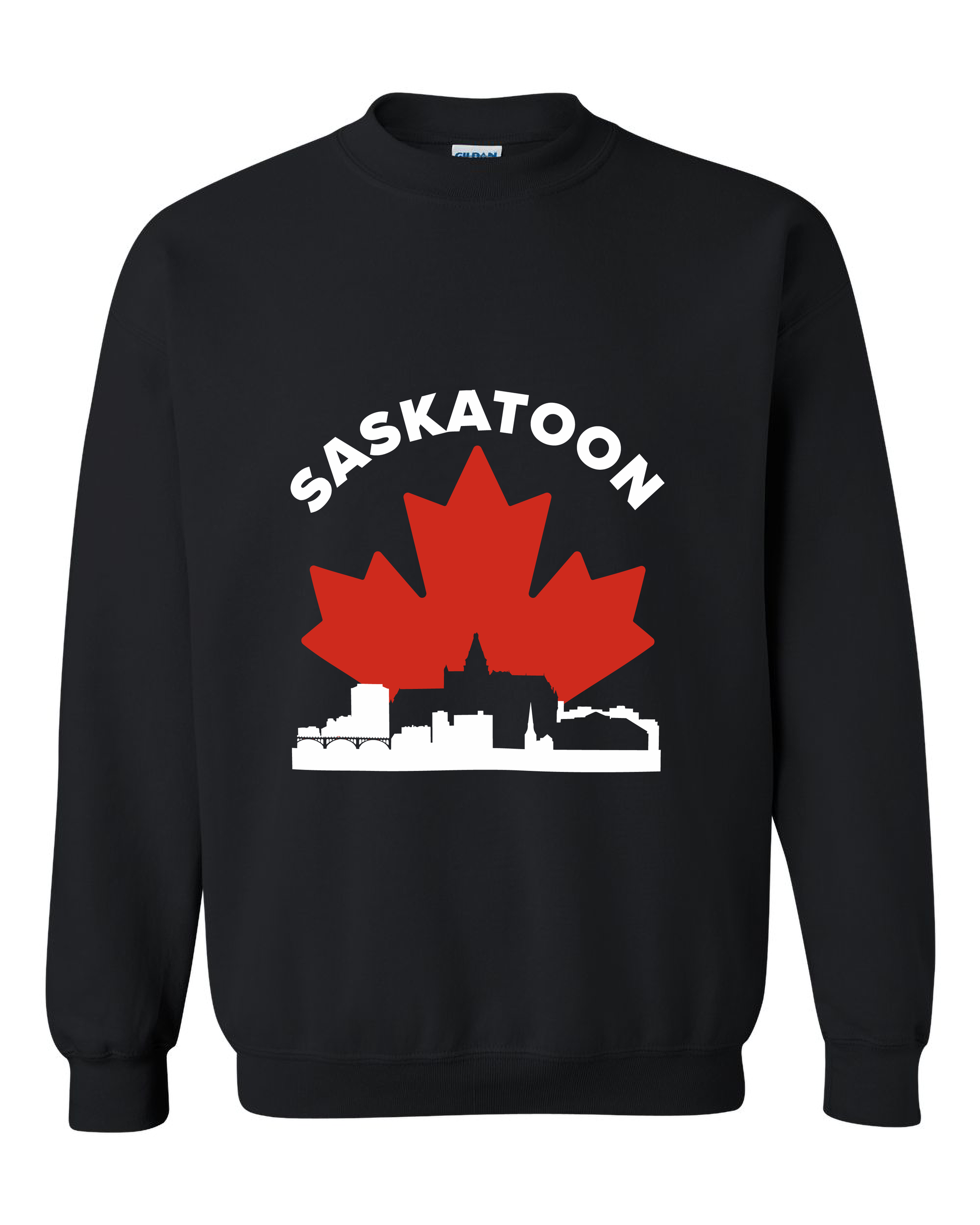 This design depicts the Saskatoon skyline set against a bold maple leaf.