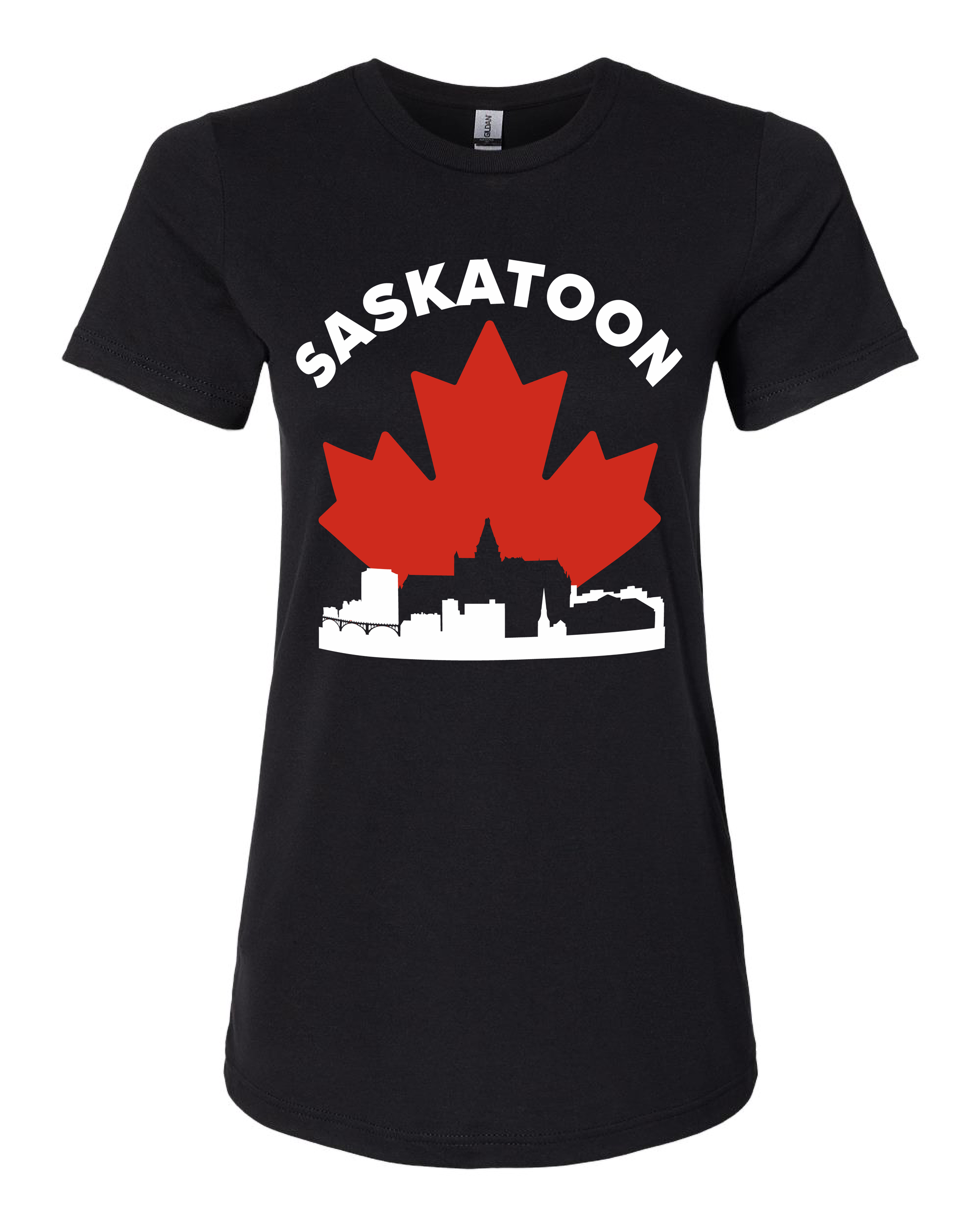 This design depicts the Saskatoon skyline set against a bold maple leaf.