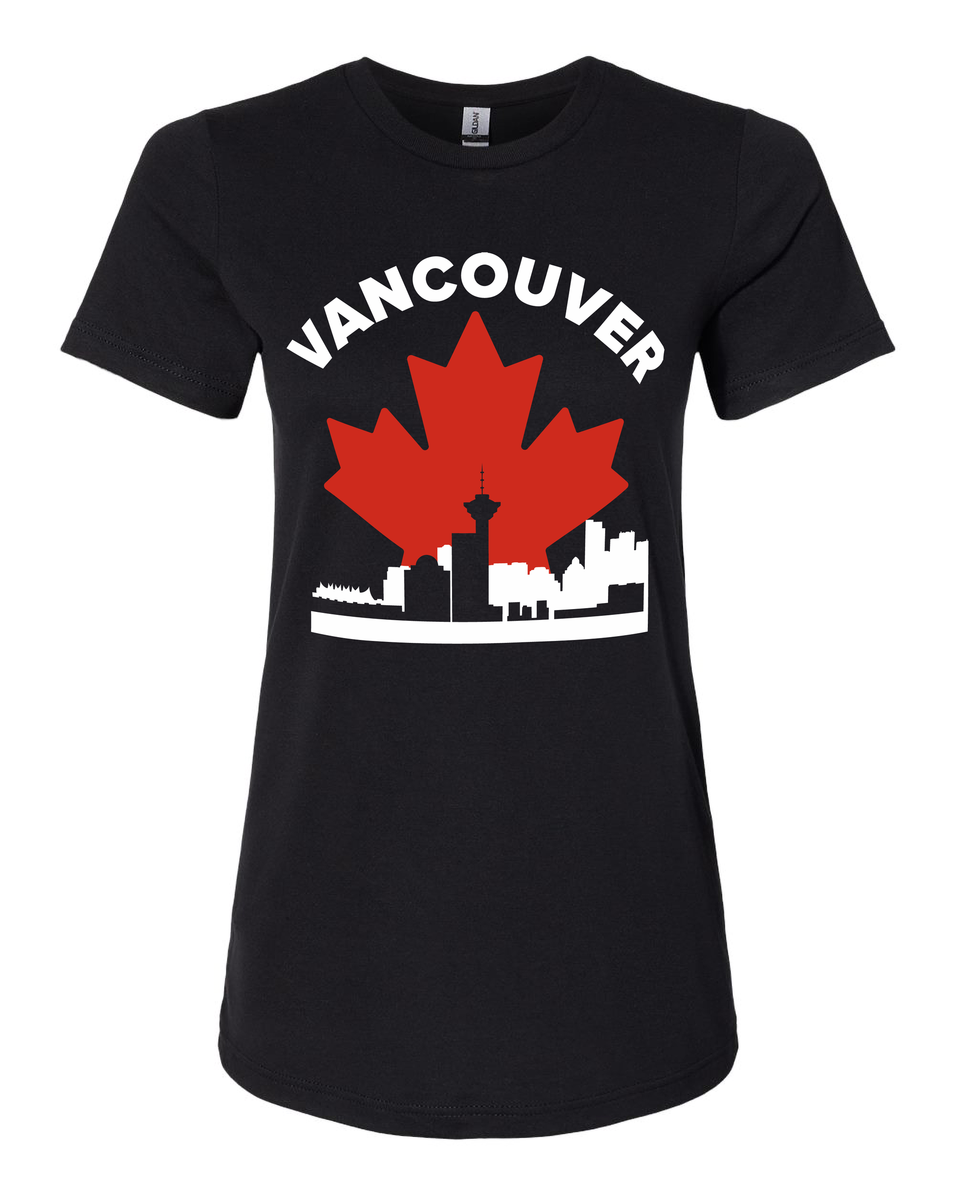 This design depicts the Vancouver skyline set against a bold maple leaf.