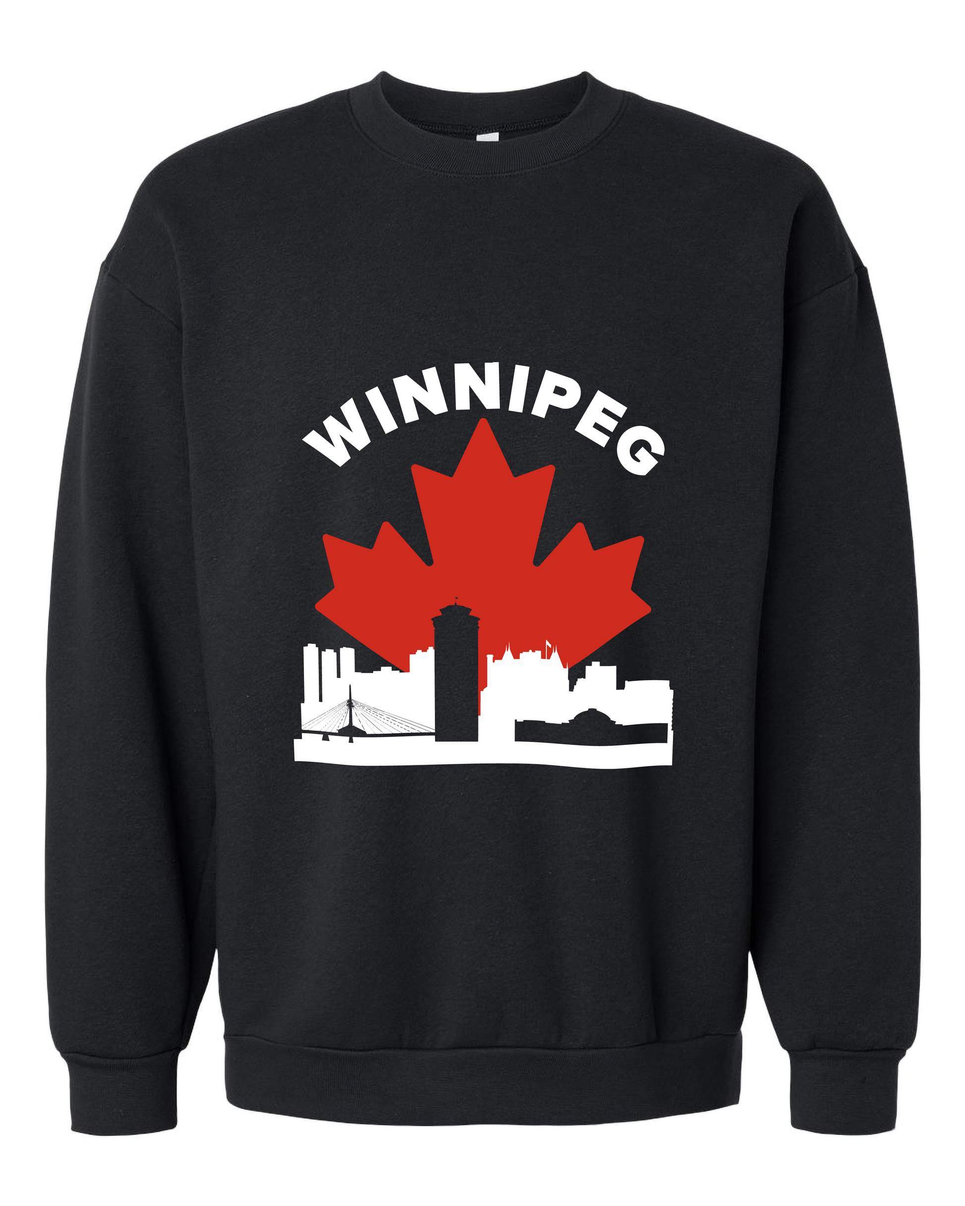 This design depicts the Winnipeg skyline set against a bold maple leaf.