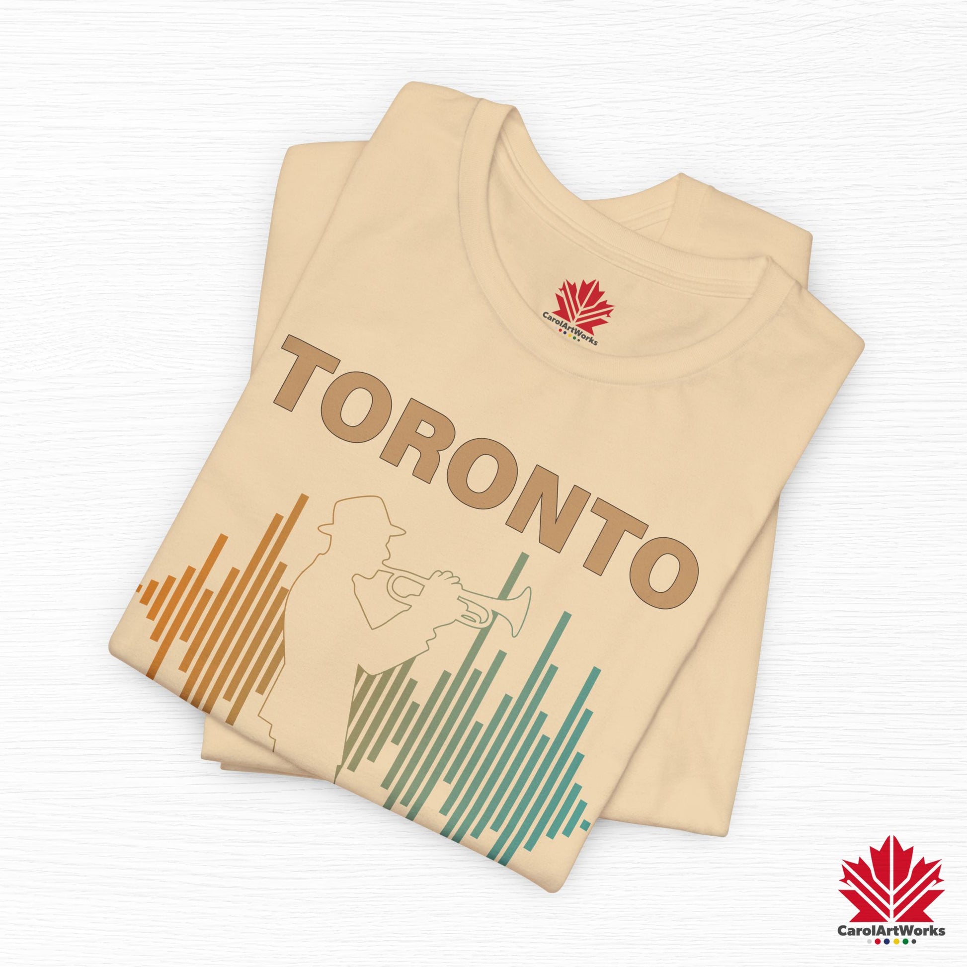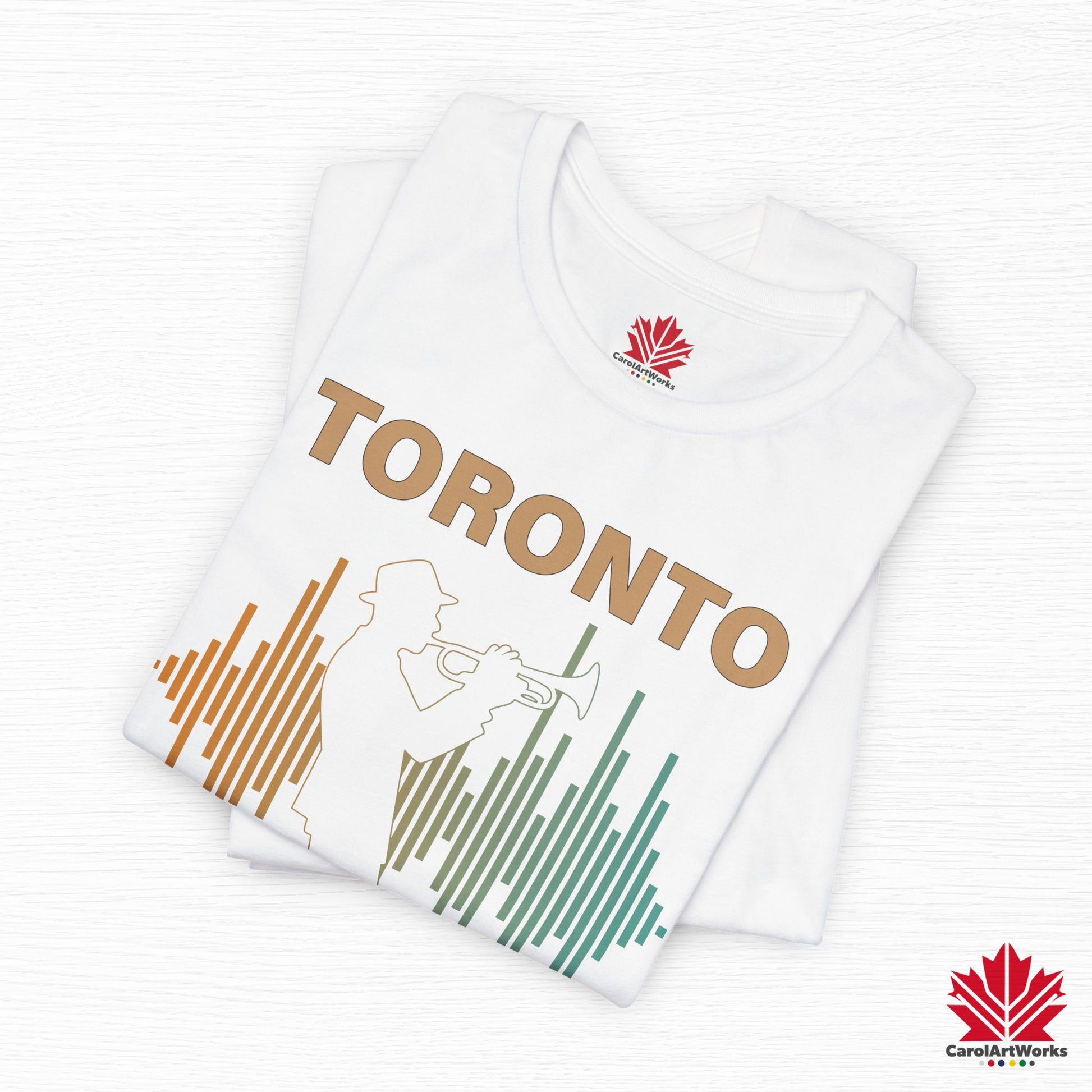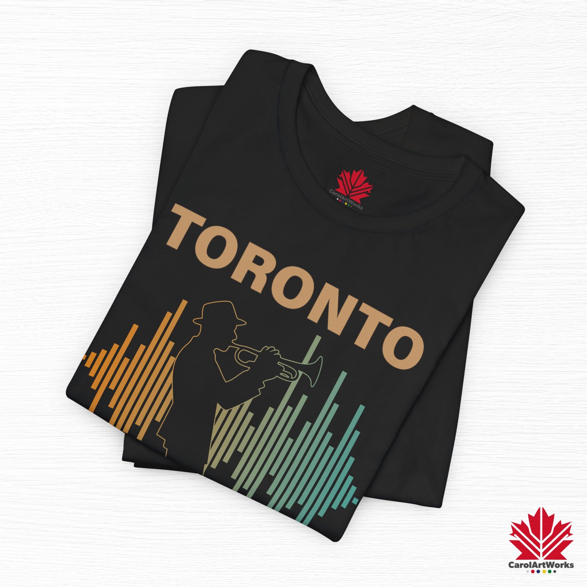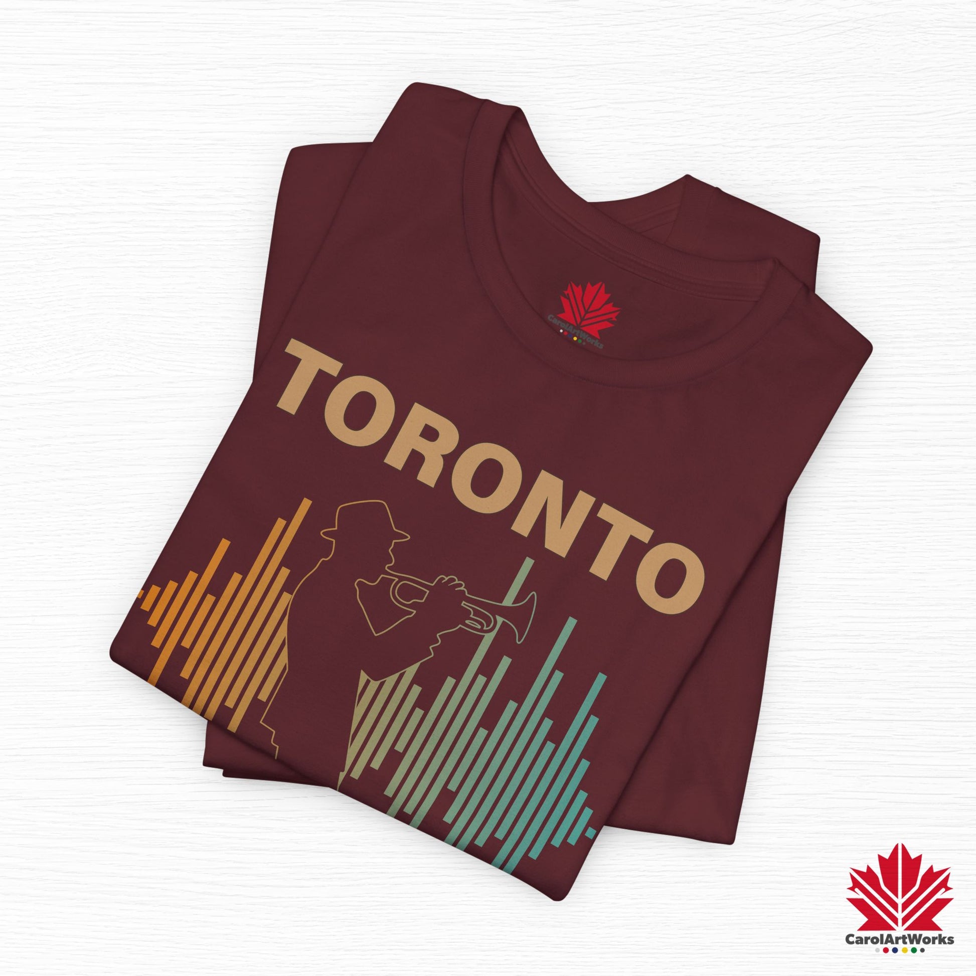 The silhouette of a trumpet player, caught mid-note, merges with soft, gradient soundwaves – from golden dusk to teal morning – echoing through the maple-leaf skyline. Whether you're a music lover, a street-style fan, or just vibing on Yonge Street, this piece says: Toronto is more than a place – it's a sound.